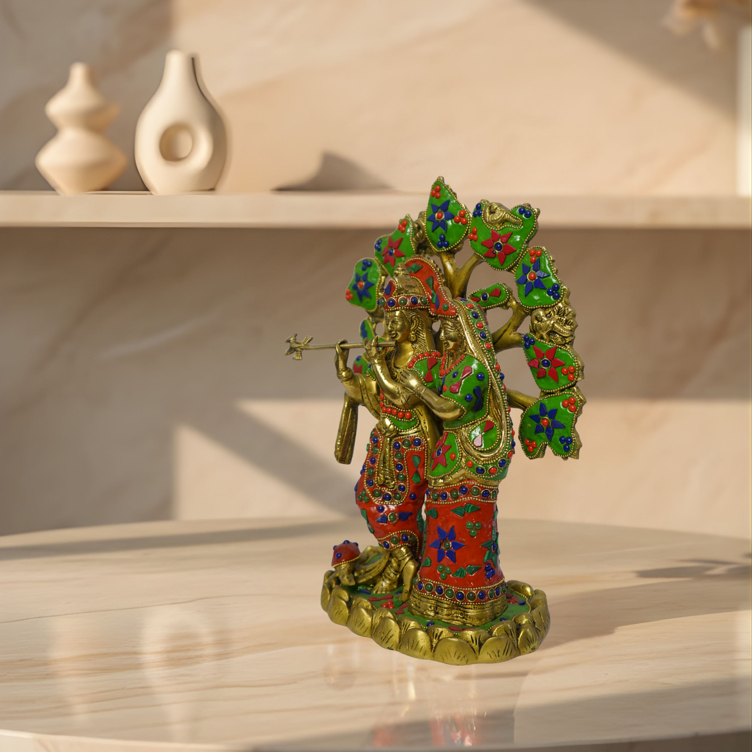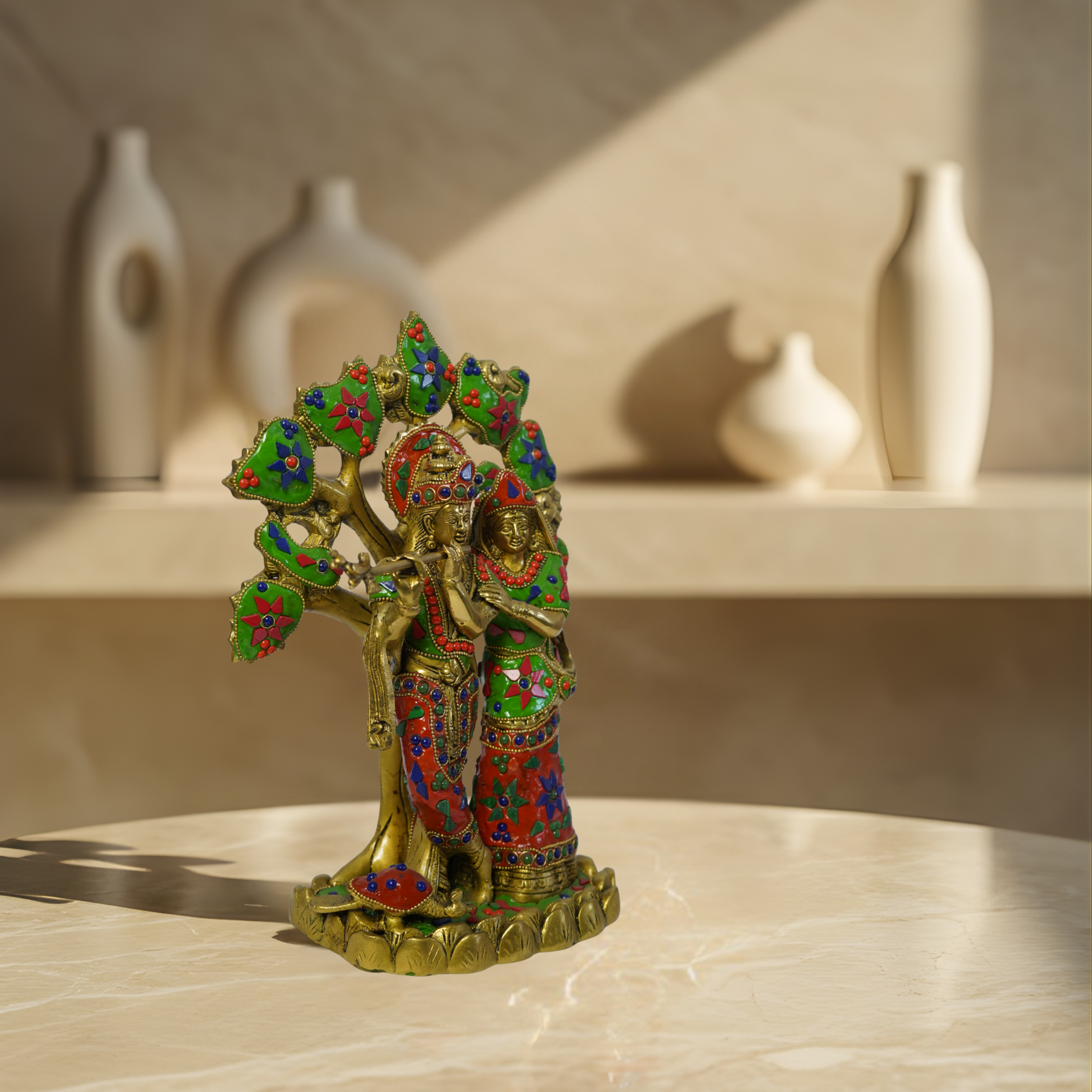 Vibrant colourful Radhe Krishna decorative idol for home or temple.